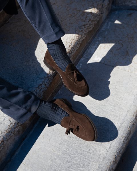 Goodyear welted construction Handcrafted in Portugal Premium water repellent suede from British Charles F. Stead Leather board heel stiffeners and cork filling